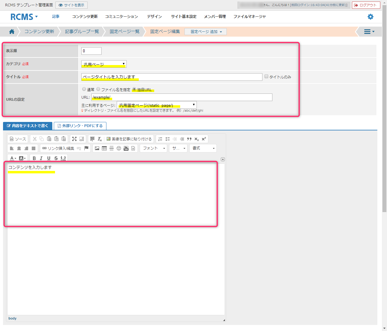 各項目を入力して、「追加する」ボタンをクリックし、ページを追加します。